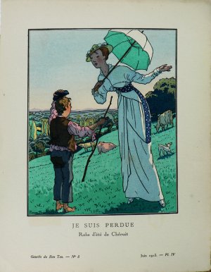 This fabulous highly stylized, carefully colored antique print was contained in a series entitled ‘Gazette du Bon Ton’; a periodical devoted to the depiction of Parisian high fashion designs of the first quarter of the nineteenth century. The clothing, background elements, the postures, and the attitudes of the subjects all reflect a taste for the sophisticated style and taste of the art deco jazz age. The names of the designers of each of the fabulous clothing are recorded below the capitalized French titles. In this case, the lost boy approaches a beautifully attired woman dressed in a Cheruit creation and carrying a parasol.