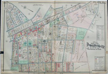 We have a large selection of large scale maps of properties (residential, commercial, and institutional) that extended along the tracks of the Pennsylvania Railroad between City Line at Overbrook and Paoli to the west. The maps contain fascinating information about property owners, types of buildings on the properties with frame, brick, barns, stables, green houses all shown, sewer lines, steam railways, electric railroads and “macadamized” roads. This map was included in a particularly beautifully colored atlas.