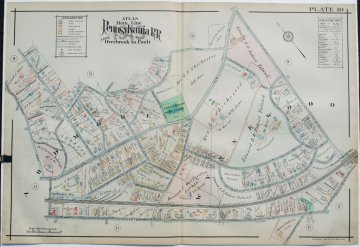 We have a large selection of large scale maps of properties (residential, commercial, and institutional) that extended along the tracks of the Pennsylvania Railroad between City Line at Overbrook and Paoli to the west. The maps contain fascinating information about property owners, types of buildings on the properties with frame, brick, barns, stables, green houses all shown, sewer lines, steam railways, electric railroads and “macadamized” roads. This map was included in a particularly beautifully colored atlas.
