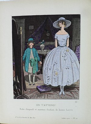 This fabulous highly stylized, carefully colored antique print was contained in a series entitled ‘Gazette du Bon Ton’; a periodical devoted to the depiction of Parisian high fashion designs of the first quarter of the nineteenth century. The clothing, background elements, the postures, and the attitudes of the subjects all reflect a taste for the sophisticated style and taste of the art deco jazz age. The names of the designers of each of the fabulous clothing are recorded below the capitalized French titles. In this case, an elegantly dressed woman tells her equally beautifully attired child that she is waiting. Both the woman’s dress and the child’s coat are by Lanvin.