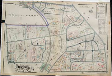 We have a large selection of large scale maps of properties (residential, commercial, and institutional) that extended along the tracks of the Pennsylvania Railroad between City Line at Overbrook and Paoli to the west. The maps contain fascinating information about property owners, types of buildings on the properties with frame, brick, barns, stables, green houses all shown, sewer lines, steam railways, electric railroads and “macadamized” roads. This map was included in a particularly beautifully colored atlas.