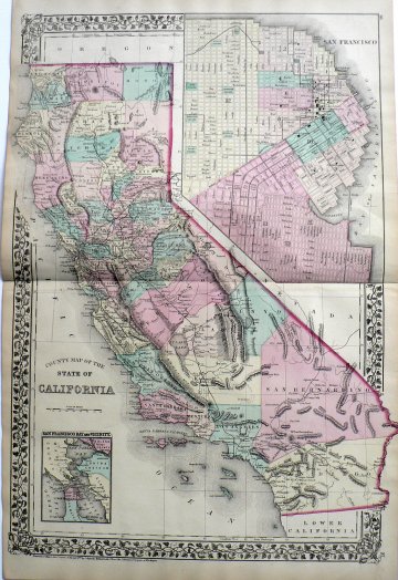 A beautiful oversized large scale original antique map of the entire state with topographical detail and place names clearly legible. The upper right quadrant is filled with a detailed plan of San Francisco. The whole is surrounded by Mitchell’s signature decorative border.