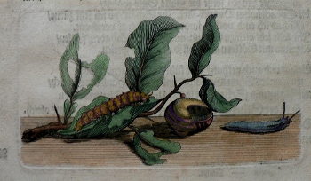 A caterpillar and a slug feast on a branch in this early German engraving.