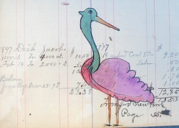 A whimsical work from a wonderfully charming series in the style of depression era Lancaster County, Pennsylvania Mennonite watercolors of birds and animals including farm, domestic, and fanciful creatures. Each work was painted on 19th century ledger sheets with brown ink notations.