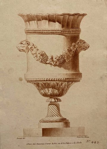 One of four designs for vases in the neo-classic style. Lettered ‘Percenet del. Demarteau direxit’ and ‘A Paris chés Demarteau Graveur du Roi rue de la Pelterie a la Cloche’ along with publisher’s serial numbers ‘No.442’. A lovely etching of a decorative vase with garland and acanthus leaves, lion head decoration on a square base.