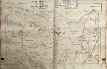 This map of East Goshen offers a lovely view of properties and buildings throughout the township. Meeting houses and school houses are among them, as well as many stables and barns. Farms and properties with 100 acres or more are located all across the township, as well as different creeks and dams. West Chester and Philadelphia Road is located in the bottom right corner of the map, and was a trolley road.