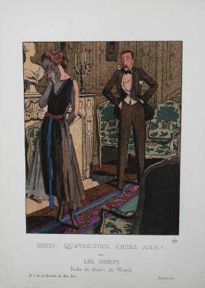 This fabulous highly stylized, carefully colored antique print was contained in a series entitled ‘Gazette du Bon Ton’; a periodical devoted to the depiction of Parisian high fashion designs of the first quarter of the nineteenth century. The clothing, background elements, the postures, and the attitudes of the subjects all reflect a taste for the sophisticated style and taste of the art deco jazz age. The names of the designers of each of the fabulous clothing are recorded below the capitalized French titles. In this case, a man and a woman elegantly dressed for dinner in Worth couture discuss what has brought her to tears.