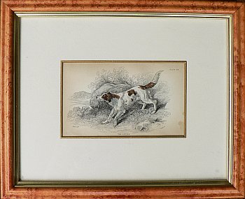 A wonderfully natural and detailed engraving of one of the preeminent bird hunting dogs, the English setter. The finely detailed background and depiction of the physical characteristics of the breed were skillfully engraved by W.H. Lizars, John James Audubon’s first choice as engraver of his Birds of America.