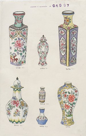 For almost 300 years, since it was produced under the patronage of Louis XV, Sevres porcelain has been highly regarded for its high quality and beautiful design. These watercolors and hand water colored pouchoir prints are original designs created by the Sevres artist Gabriel Fourmaintraux to serve as guides for the painters of the porcelain and as sales tools for prospective clients showing them the range of sizes, decorative motifs, and finishing available at varying prices. The inclusion of pencil notations of prices, sizes and finishing options and stamps indicating order numbers are evidence of the fascinating role of the works as working designs. Our collection includes depictions of breakfast, dinner and dessert serving pieces, boxes, trays, lamps, table and toiletry accessories, vases, etc. Each is a beautiful and unique historical record of French decorative art.