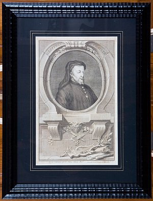 Portrait engraving by Houbraken from a series of important British figures based on painted portraits from famous collections. Published by I & P Knapton in London, c. 1741. Each subject is shown in a classical pose and placed in an architectural surrounding.