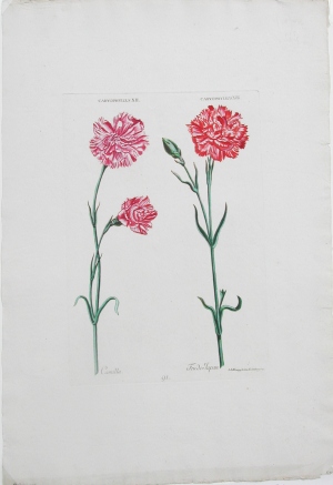 Georg Dionysius Ehret (1708-1770) was the dominant influence in European botanical art during the mid 18th century. He was trained as a gardener, so his scientific and practical interest in his subjects was assured. Ehret painted many extraordinary watercolors and water colored engravings. These works reveal his love of plants and his unique talents as a botanical artist. Ehret’s travels brought him into contact with Sir Hans Sloan, Carolus Linneaus, Philip Miller, Johann Weinmann and many other important scientists and botanical artists of his time, but it was his generous patron, Dr. Christof Trew who made his most famous works possible; Hortus Nitidissimus and Plantae Selectae. This beautiful image was contained in Hortus Nitidissimus, a work which is considered to be “one of the finest records of cultivated flowers of the period” (Dunthorne, #310). Dr.Trew carefully selected beautiful images created by Ehret, Wirsing, Seligmann, Keller, Eisenberger and others to serve as the basis of the engravings for his volumes. These carnations were drawn and engraved by A.I. Wirsing.
