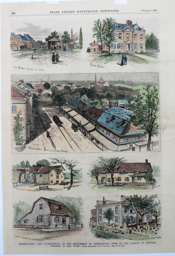 A detailed and artistically rendered compilation of views drawn by C. Upham showing “Old Market Square in 1783”, “Chew House”. “Germantown Avenue – Looking North”, “First Mill in Germantown”, “Building Used as a Hospital During the Revolution”, “Oldest House in Germantown”, and “St. Michael’s Lutheran Church.”