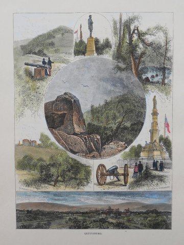 was the last in a long tradition of American view or gift books. This extremely popular work was illustrated with finely engraved steel and wood plates of various North American cities and natural wonders. Much of what Victorian Americans knew about the Untied States was gathered from the pages of Bryan’s informative and beautiful text, published by D. Appleton and Company of New York in 1872. Picturesque America allowed readers to explore the great United States without leaving their arm chairs. A wonderful view of the historic Civil War battlefield and monuments at Gettysburg.