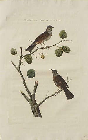 A beautiful image of a pair of hedge warblers from the first comprehensive account of the birds of Holland including all the species known to exist in the Netherlands through the time of publication and many migratory birds found elsewhere in Europe and in the Americas. The birds are shown in their natural surroundings and in their natural attitudes.