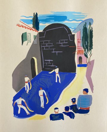 Milivoj Uzelac (1897–1977) was a painter influential in the Zagreb (Croatia) modern art scene of the 1920s and 30s. Croatian artists like Uzelac were influenced by the art scene in Vienna and Munich and post-impressionism work from Paris, studying the latest trends and integrating them into their own work. Uzelac spent much of his professional life in France, absorbing current ideas of classicism and cubism, receiving commissions and successfully selling his work. Uzelac produced an extensive number of works in a wide range of techniques: oil, tempera, lacquer, gouache, chalk, ink, and graphics. He created many decorative panels for private homes and public spaces, stage sets, posters, illustrations and ceramics. His move to the south of France produced a series of lighter paintings in a brighter color palette. Among his vast output were a string of great works in which references to Matisse and Derian were executed in Uzelac’s own personal style. These pochoir print were included in a portfolio of prints published for the 1932 Olympics in Los Angeles as a limited edition of 750, number 47.