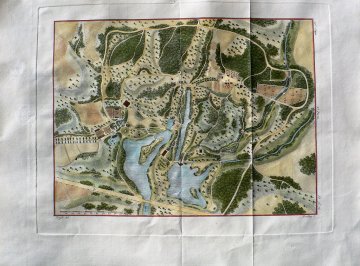 This intricately detailed print provides a bird’s eye view of a property including buildings, paths, creeks and lakes.