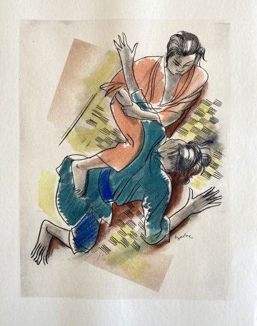 Milivoj Uzelac (1897–1977) was a painter influential in the Zagreb (Croatia) modern art scene of the 1920s and 30s. Croatian artists like Uzelac were influenced by the art scene in Vienna and Munich and post-impressionism work from Paris, studying the latest trends and integrating them into their own work. Uzelac spent much of his professional life in France, absorbing current ideas of classicism and cubism, receiving commissions and successfully selling his work. Uzelac produced an extensive number of works in a wide range of techniques: oil, tempera, lacquer, gouache, chalk, ink, and graphics. He created many decorative panels for private homes and public spaces, stage sets, posters, illustrations and ceramics. His move to the south of France produced a series of lighter paintings in a brighter color palette. Among his vast output were a string of great works in which references to Matisse and Derian were executed in Uzelac’s own personal style. These pochoir print were included in a portfolio of prints published for the 1932 Olympics in Los Angeles as a limited edition of 750, number 47.