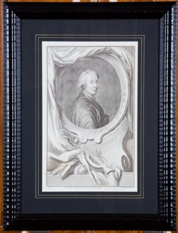 Portrait engraving by Houbraken ater Kneller from a series of important British figures based on painted portraits from famous collections. Published by I & P Knapton in London, c. 1741. Each subject is shown in a classical pose and placed in an architectural surrounding.