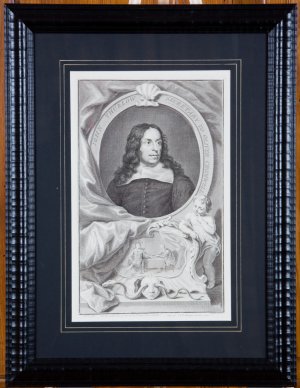 An engraving based upon a painting in the Collection of Lord James Cavendish. Portrait engraving by Houbraken after Cooper from a series of important British figures based on painted portraits from famous collections. Published by I & P Knapton in London, c. 1741. Each subject is shown in a classical pose and placed in an architectural surrounding.