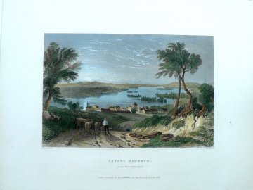 Travel books which would describe sites with text and engraved illustrations were extremely popular during the 19th century.  William Bartlett was one of the most talented and prolific of travel artists.  This beautifully detailed engraving shows the small lakeside town as it existed in the first half of the 19th century. It is a wonderfully bucolic scene with far distant views across the lake and a farmer walking his cows down the sandy road to shelter for the evening.