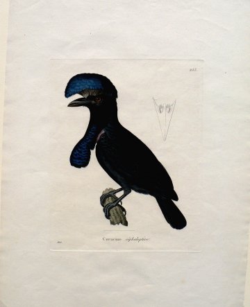 N Huet, one of the best known ornithologists and natural history artists of the early nineteenth century, was one of the two artists selected to illustrate the magnificent work of 600 etched plates included in Nouveau recueil de planches coloriees d’oiseaux. The work is particularly highly valued for its stunning depictions of tropical birds. The species depicted here, most often found in the Amazon regions of South America is now known as Cephalopterus penduliger.