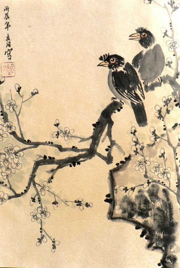 Ma-mei. (Black and white birds on branch with white blossoms) Watercolor c.1930