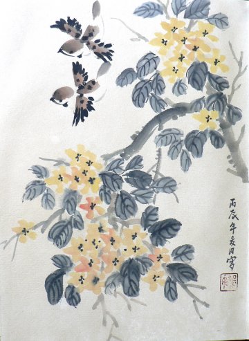 Ma-mei. (Songbirds with yellow and orange blossoms) Watercolor. ca. 1930