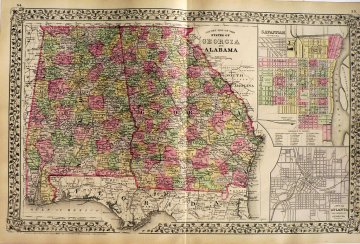 A bright map by Samuel Augustus Mitchell in the style that made his maps famous. There is lots of easy to read detail of Alabama, Georgia and the Florida panhandle. There are also two inset maps : a detailed map of Savannah with key below identifying buildings, squares, etc. and an inset of Atlanta showing the superior rail transportation that prompted the move of the capital 15 years before from Milledgeville to Atlanta.