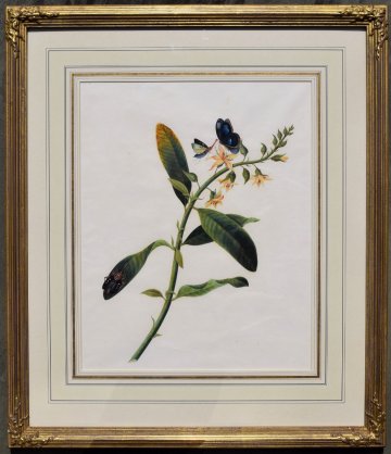These watercolors were meant to be displayed. As they are fragile works of ground pigment on paper, they are/were susceptible to the elements, and very few exist in good condition and very few complete sets ever come onto the market. This pair of unsigned large watercolor botanical studies are painted on watermarked Whatman paper. They are delightful in their design and accuracy and the insects heighten what is already a pleasing composition. They are archivally framed in gold leaf carved corner frames with French wash mattings.