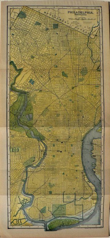 The information on this map was considered so complete that it was republished three times; in 1895, 1903 and 1908. It covers the city limits from Cheltenham Township, Montgomery County in the North, to the Delaware River, Camden and Kensington on the East, south to the confluence of the Schuylkill and the Delaware rivers at the Navy Yard and west to Fairmount Park and Mount Airy. This map includes lots of detail including street names, parks, green spaces and reservoirs.