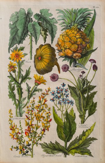Plate 20 “Hura, Pineapple, Golden Arctotis, Alated Verbesina, Canary Broom, Rigid Shrub Senecio””