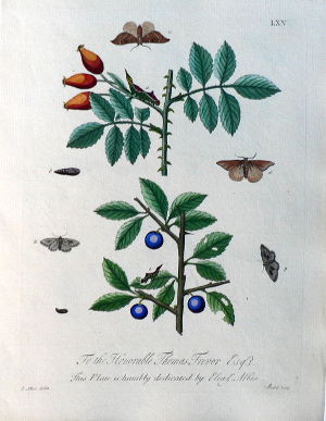 Albin created these beautifully decorative early 18th century depictions of moths, caterpillars, butterflies pupae and their habitats  for inclusion in A Natural History of Insects, the earliest work devoted to the depiction of British moths and butterflies.  Each of the beautifully engraved plates is dedicated to a member of English nobility or a person of high rank in early 18th century English society.