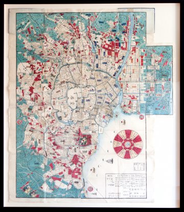 A fabulously decorative large scale plan of Tokyo with the imperial palace placed in the middle. The palace name is written in upside down characters in deference to the royal family.