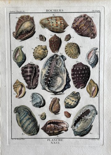 This engraving was included in the edition printed after Dezallier’s death in Paris in 1780. Successful journeys of exploration brought to Europe all manner of interesting and new specimens of natural history, and shells held a great appeal. Dezallier’s book described various exotic varieties of shells and corals, with an explanation of the shape, geographic location, manner in which they were collected and he even suggested ways of displaying these specimens in Cabinets of Curiosity (the height of fashion of the day).