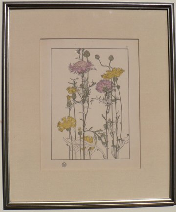 Jeannie Foord was a Scottish artist known for her rare prints of flowers. The presentation of the stems and blooms extending beyond, or cropped within, the confines of the surrounding neat line reflects her familiarity with Japanese wood block prints. Each floral print is signed and dated within the plate with a chop mark, another reference to Japanese print makers and a device that was used by artisans of the artists of the Arts and Crafts and Art Nouveau movements. Foord’s botanicals inspired artists of the period who used her designs in their stained glass, fabric and woodworking.