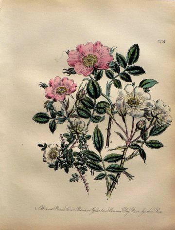 Plate 34. 1. Burnet Rose 2. Sweet Briar, or Eglantine 3. Common Dog Rose 4. Ayrshire Rose