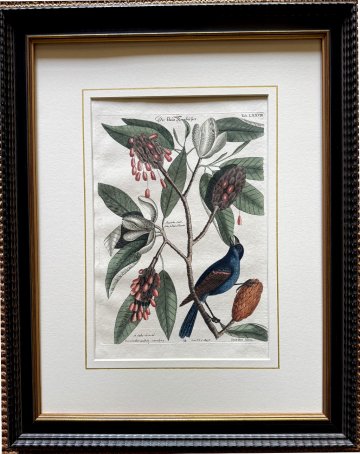 Mark Catesby (English 1682-1749) visited the American colonies in 1712. His sister, the wife of the secretary to the Governor of Virginia provided him with many social and scientific contacts and Catesby indulged his passion for collecting bird and plant specimens, all new to the Englishman. In 1722 Catesby returned to America to pursue a pet project, his Natural History of Carolina Florida and the Bahama Islands which was published in London between 1731 and 1743. Catesby’s descriptions along with his illustrations of North American birds was more natural than any earlier attempt. He drew from living specimens and included foliage backgrounds. In fact, demand was so strong for Catesby’s work, that a German natural historian named Johann Michael Seligmann (1720-1762) re-engraved the plates in Nuremberg and reissued A Natural History between 1749 and 1776. This engraving was included in that edition of the famous work. Seligmann added German and French titles and references to Linnaean forms of classification. Seligmann also re-engraved plates from George Edward’s Natural History and bound them together with his re-engravings of Catesby’s work. The resulting natural history was so popular that it appeared in several editions and three languages during the 18th century. This charming magpie is balanced on a lily bulb, the white lily flowers fully in bloom.
