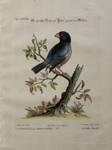 George Edwards was an ornithologist and bird artist whose most famous work, A Natural History…, was published between 1743 and 1764. It was a beautifully illustrated book in which Edwards presented his subjects in landscape backgrounds, an innovation at the time. The work was highly valued for its decorative plates and for the ornithological information it contained. In fact, demand was so strong that Johann Michael Seligmann (1720-1769) re-engraved the plates in Nuremberg and reissued A Natural History between 1749 and 1770 titled Collection of the diverse birds foreign and commom after the works of Edwards and Catesby. This engraving was included in that edition of the famous work. Seligmann added German and French titles and references to Linnaean forms of classification. Seligmann also re-engraved plates from Catesby’s Natural History of Carolina, Florida and the Bahama Islands and bound them together with his re-engravings of Edwards’ work. The resulting natural history was so popular that it appeared in several editions and three languages during the 18th century. Handsome male and female