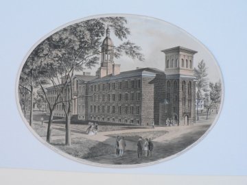 There are very few antique views of Princeton University published before the end of the 19th century. This lovely large lithograph presents a slightly angled view of Nassau Hall. The image records the Italianate towers and two central arches that were added to the building by the Philadelphia architect, John Nottman, after the structure burned in 1855.