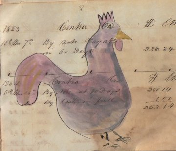 A whimsical work from a wonderfully charming series in the style of depression era Lancaster County, Pennsylvania Mennonite watercolors of birds and animals including farm, domestic, and fanciful creatures. Each work was painted on 19th century ledger sheets with brown ink notations.