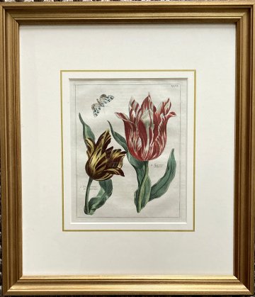 (Red striped tulips with butterfly) Nederlandsche Bloemwerk. Amsterdam 1794. Framed Matted