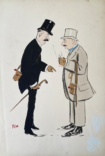 Georges Goursat (1863 – 1934) was a French caricaturist known as “Sem.” In 1888 Goursat self published three albums of caricatures, signing them “SEM.” It is thought that this was in tribute to the early 19th century French caricaturist and lithographer Charles Amédée de Noé, who signed his caricatures for the periodical “Le Monde Illustré”as “Cham.”