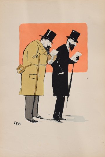 Georges Goursat (1863 ? 1934) was a French caricaturist known as ?Sem.? In 1888 Goursat self published three albums of caricatures, signing them “SEM.” It is thought that this was in tribute to the early 19th century French caricaturist and lithographer Charles Am?d?e de No?, who signed his caricatures for the periodical ?Le Monde Illustr?as “Cham.”