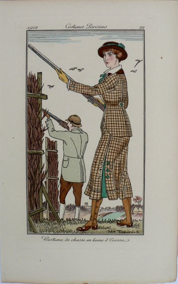 A depiction of a fabulously fashionable French man and woman dressed for a day of shooting. They stand behind a blind. Her hunting outfit included a fitted window pane Scottish woolen jacket with matching skirt, high button boots and a hat.