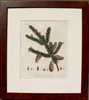 John Evelyn (1620-1796) was a prominent member of the Royal Society of London and an active member of the scientific community in the British Isles during the mid 17th century. His particular interests were horticulture and silviculture, the study of trees. This engraving was included in his best known work Silva: A Discourse of Forest -Trees… which encouraged landowners to plant trees in order to supply timber to build ships for England’s expanding navy. John Miller was the artist and engraver of the beautiful engraved illustrations. The Discourse was first published in 1664. The work went into four editions during Evelyn’s lifetime and was considered important enough to have also been published in four posthumous editions by Alexander Hunter. This engraving was included in Hunter’s 1786 edition.