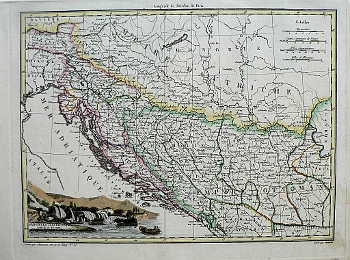 , published in Paris in 1812. This map shows the lands along the eastern coast of the Adriatic Sea including what is now Slovenia, Croatia, Bosnia-Hwerzegovina, Serbia and Montegno. A lovely engraved view of a small seaside settlement is included in the lower left.