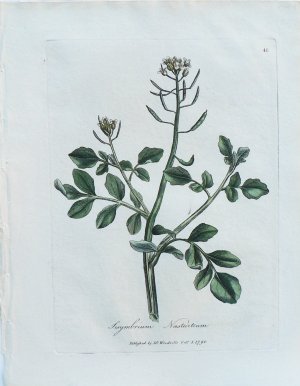 A lovely engraving of watercress, very rich in vitamins and minerals from William Woodville’s Medical Botany… The engravings in the series show the close ties between botany and 18th century medicine. They depict plants in the Royal College of Physician’s list of “material medica” at a time when the pharmacopoeia of the day consisted entirely of herbs and plants. Medical Botany… was the predecessor to today’s Physician’s Desk Reference. This fine example from the first edition of the work was engraved by James Sowerby (1757-1822) himself a noted scientist, artist and engraver who illustrated some of the most famous late 18th century botanical works.