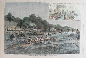 A wonderfully detailed engraving of the many competing teams, onlookers in row boats, paddlewheelers, tugboats and sail boats and lining the banks of the river based upon the drawing of W.P. Snyder. An inset shows the “Wesleyan Crew Greeting the Victorious Columbias.”