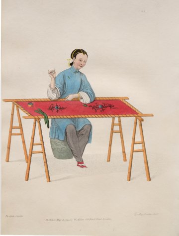 (Woman Embroidering) After Pu Qua. Costume of China. London, [1799-1804] – 1821. Framed